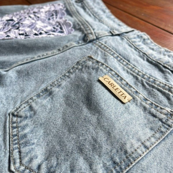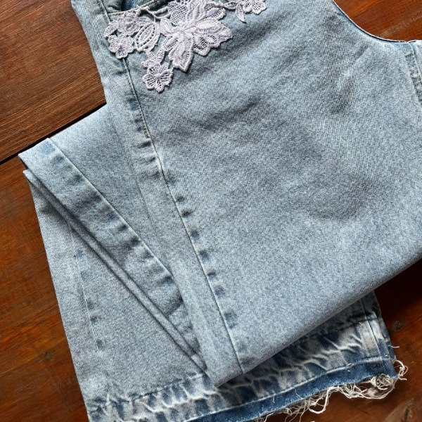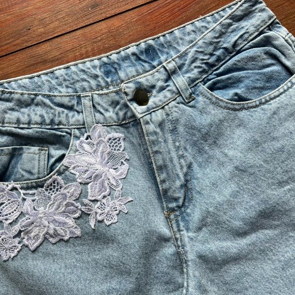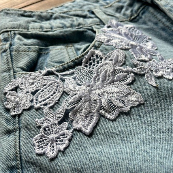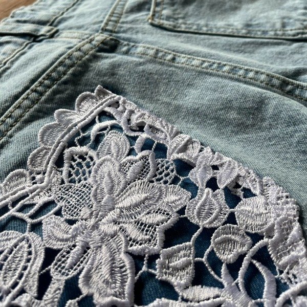 Descubrí nuestro jean de corte recto ancho para mujer, confeccionado en denim rígido de alta calidad. Esta prenda única ha sido intervenida artesanalmente con delicados detalles de guipiure blanco en el bolsillo delantero y trasero, aportando un toque femenino y sofisticado a un clásico atemporal.